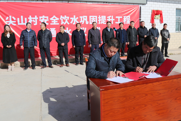 通水儀式上,集團公司代表援建單位應邀發(fā)言,并與尖山村村委會簽署工程移交協(xié)議。